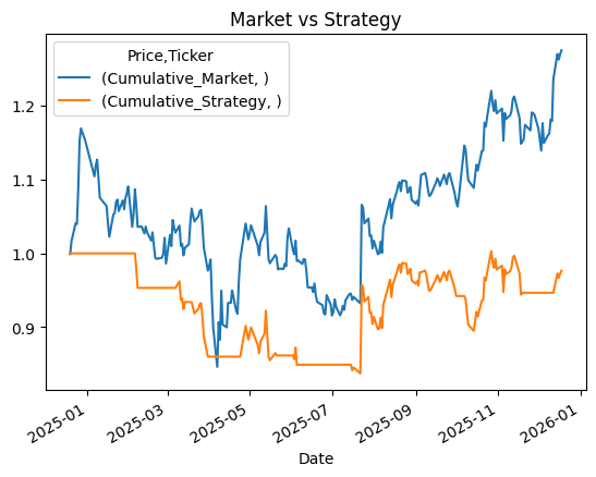 data[['Cumulative_Market', 'Cumulative_Strategy']].plot(title="Market vs Strategy"