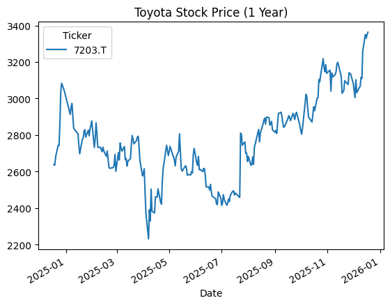 data['Close'].plot(title="Toyota Stock Price (1 Year)")